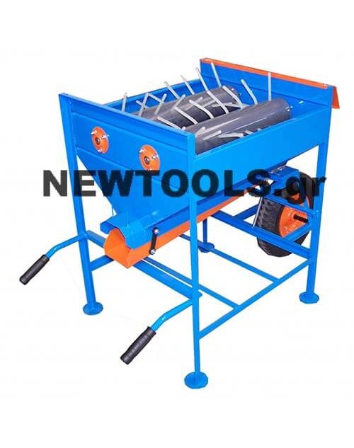 Ραβδιστικός πάγκος 2 κυλίνδρων ωθούμενος 1 τροχού , κόσκινο διαχωρισμού καρπού και σάκιασμα του καρπού. Ελαφρύς και ευκολοκίνητος πάγκος συλλογής .