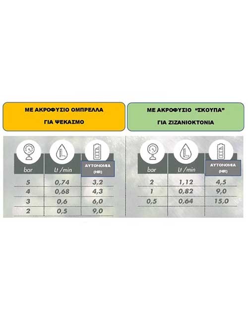 | Εξοπλισμός | Αυλός τηλεσκοπικός 80-120 cm, μανόμετρο γλυκερίνης, μπαταρία, φορτιστής, 2 ορειχάλκινα ακροφύσια, ιμάντες ανάρτησης |