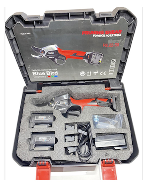 Το ηλεκτρονικό ψαλίδι μπαταρίας PS22-38 Blue Bird με 2 μπαταρίες ιόντων λιθίου είναι κατάλληλο για το κλάδεμα ελιάς, αμυγδαλιάς, αμπελιών, εσπεριδοειδών, φιστικιάς και καρυδιάς. Με εργονομικό σχεδιασμό και διπλής κοπής Ø25-Ø38 mm. Διαθέτει λεπίδες υψηλής κοπτικής ικανότητας από ατσάλι SK5 Ελβετίας. Αντιολισθητική λαβή με 2 λάμες ταυτόχρονης κίνησης για εξασφάλιση καλύτερης κοπης. Διαθέτει οθόνη led για να βλέπεται τον αριθμό κοπών και το επίπεδό φόρτισης. Άνεση στον χρήστη λόγω μη ύπαρξης καλωδίων, με ισορροπημένη κατανομή βάρους για ξεκούραστη χρήση. Εργασία χωρίς διακοπές λειτουργίας με εξασφαλισμένη σταθερότητα από την αρχή μέχρι το τέλος.