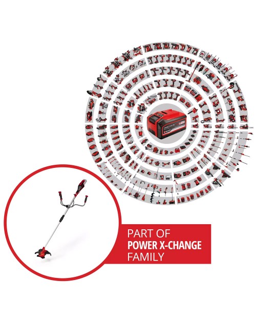 Θαμνοκοπτικό μπαταρίας της Einhell, με ελεγχόμενη λειτουργία ακριβείας. Διαθέτει σύστημα κλειδώματος άξονα για εύκολη εναλλαγή εξαρτημάτων, ενώ ο κινητήρας βρίσκεται στο εμπρόσθιο τμήμα, για βέλτιστη μετάδοση κίνησης και κατανομή βάρους.