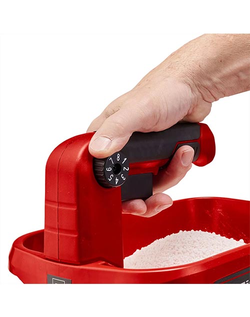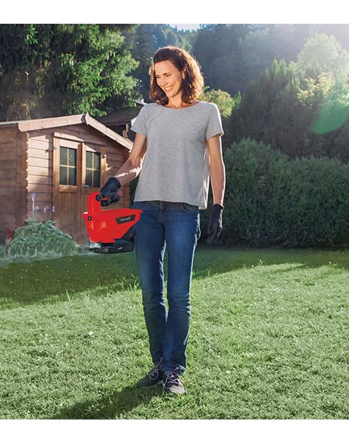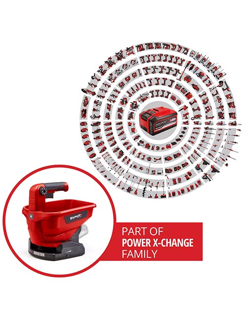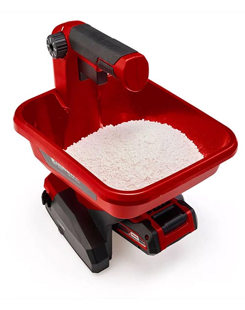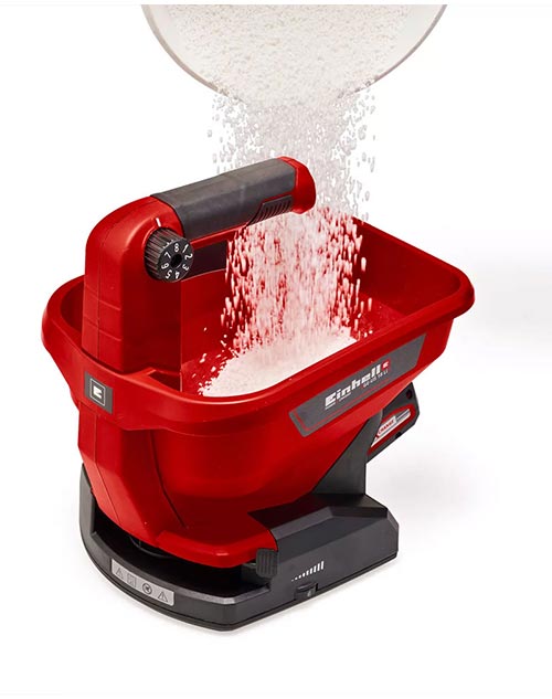 Σποροδιανομέας μπαταρίας της Einhell, κατάλληλος για διασπορά λιπάσματος, σπόρου και αλατιού. Πλάτος διασποράς 5 μέτρα, με εργονομική χειρολαβή, ρύθμιση μήκους και πλάτους διασποράς.